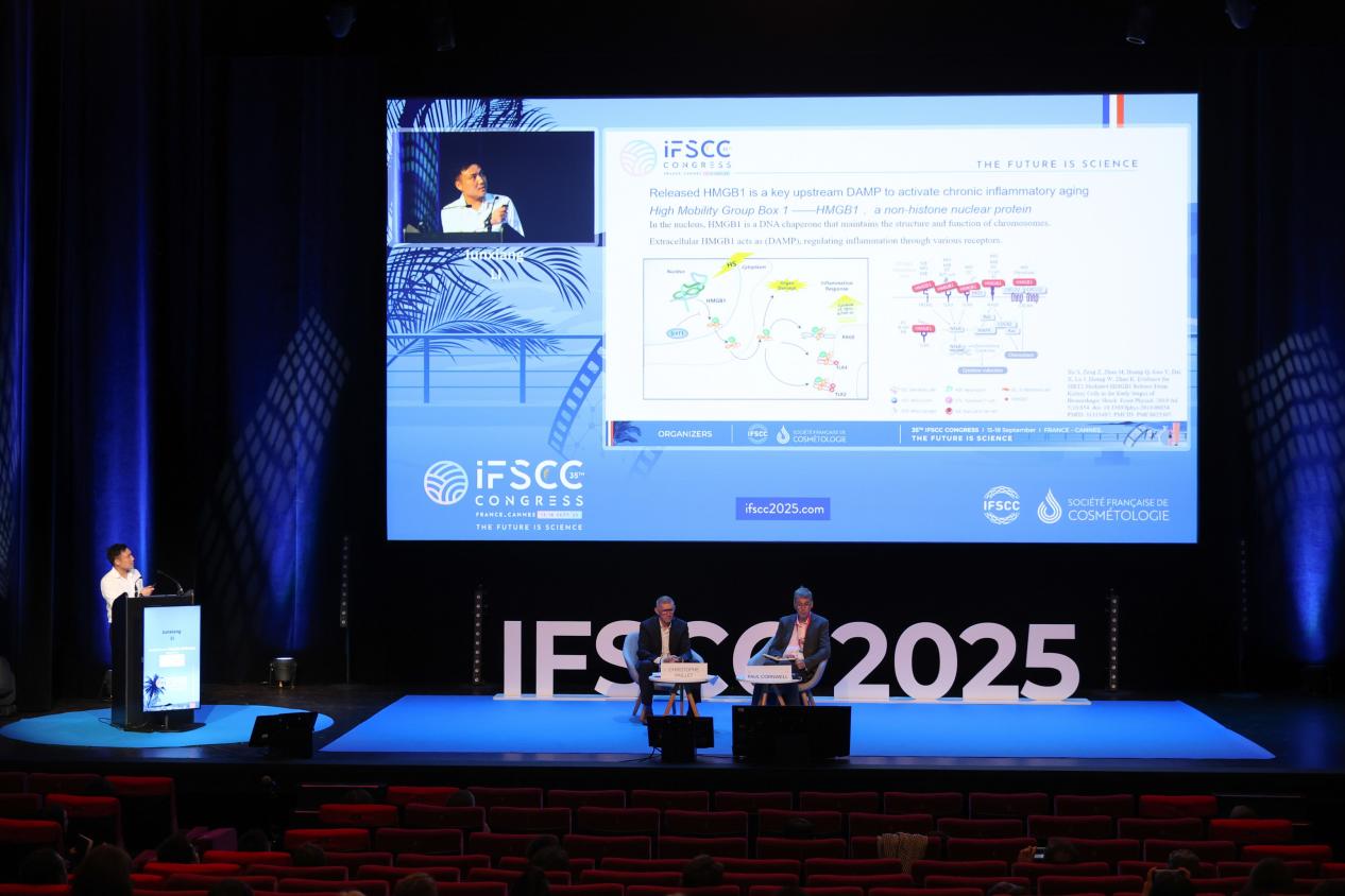 近日,国际美妆科技界传来令人振奋的消息。2025年9月15日至18日,在法国戛纳举办的第35届国际化妆品化学家学会联盟(IFSCC)盛会上,樊文花携手浙江清华长三角研究院衰老科学研发中心,凭借创新研究「养妍肽cIY-8针对肌肤炎性衰老研究成果」“Computational design of a novel cyclic peptide and its effecton reducing skin inflammatory aging by blockade of a novel targetHMGB1”,成功斩获2025IFSCC国际化妆品联盟大会十佳优秀Podium报告,与来自欧莱雅、LVMH、资生堂等集团口头报告一起,入选大会“十佳优秀报告”荣誉,作为全球化妆品科研最高水准的舞台,吸引了来自全球化妆品科学领域的顶尖专家和行业领军企业,IFSCC对大会口头报告(Podium)的筛选标准极为严格,能够入选者仅代表极少数被国际同行公认的前沿突破。这一重大奖项的颁发,标志着中国护肤科研成果正式跻身国际先进行列。